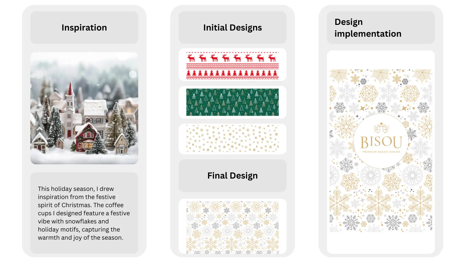 Throughout the design process, I focused on selecting materials that minimize environmental impact while maintaining high quality and durability. For the paper coffee cups, I used recyclable and compostable materials to further reduce waste. The festive snowflake patterns were carefully crafted to evoke a sense of seasonal joy while adhering to sustainable design principles. This project reinforced the importance of balancing aesthetic appeal with environmental responsibility. Impact and Future Potential